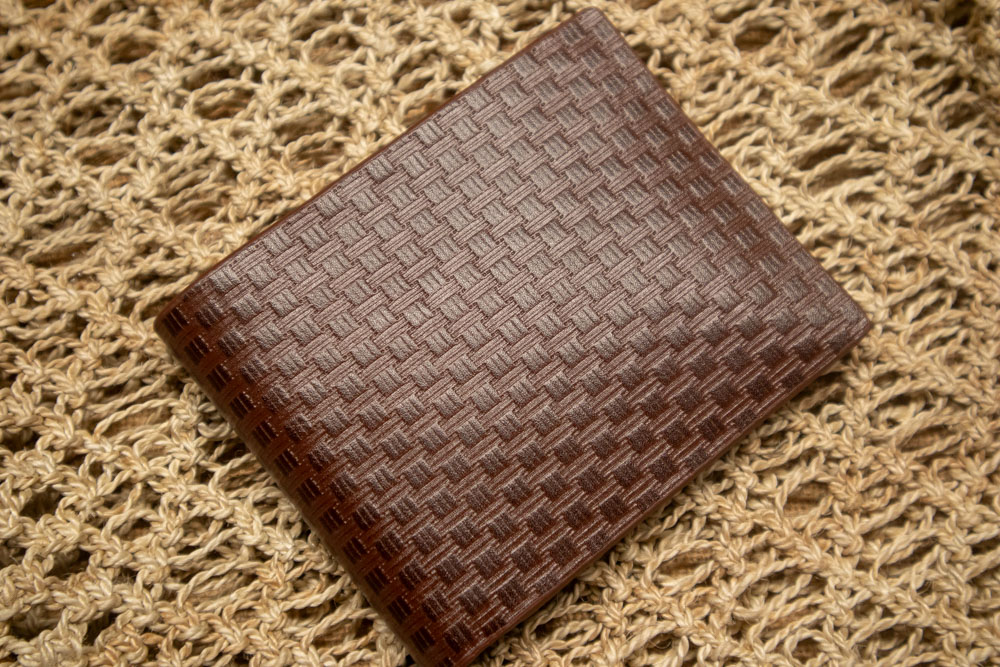 Eclat Cuir embossed basket pattern minimalist bifold wallet in black vegetable-tanned leather with 4 card slots and 1 cash chamber